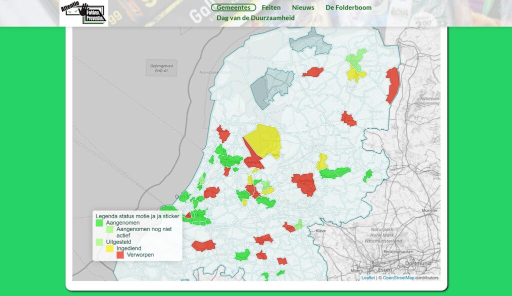 Met de actie folderpreventie.nl de aandacht gevraagd voor de invoering van de ja ja sticker. Met deze actie ook via WordPress een plugin gemaakt met de kaart van Nederland waarvan de gemeentegrenzen zijn in te kleuren afhankelijk van de status.